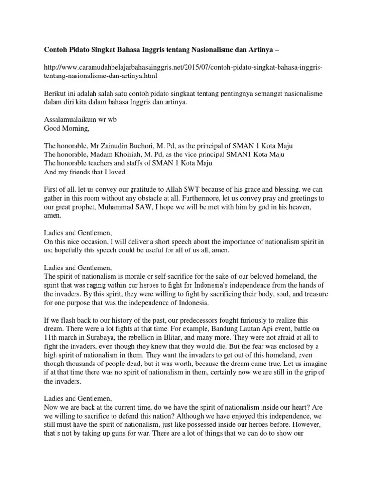 Nasionalisme dapat diartikan sebagai suatu paham yang menganggap kesetiaan tertinggi atas setiap pribadi harus disertakan kepada negara kebangsaan (nation state) . Selain itu, rasa nasionalisme dan patriotisme bisa kita tingkatkan. Yuk, kita cari tahu contoh teks pidato singkat mengenai perjuangan para pendiri bangsa dan apa saja yang harus ada di dalam pidato. Berikut ini adalah contoh dari pidato yang bertemakan tentang nasionalisme : Namun, contoh wujud bela negara saat ini antara lain: